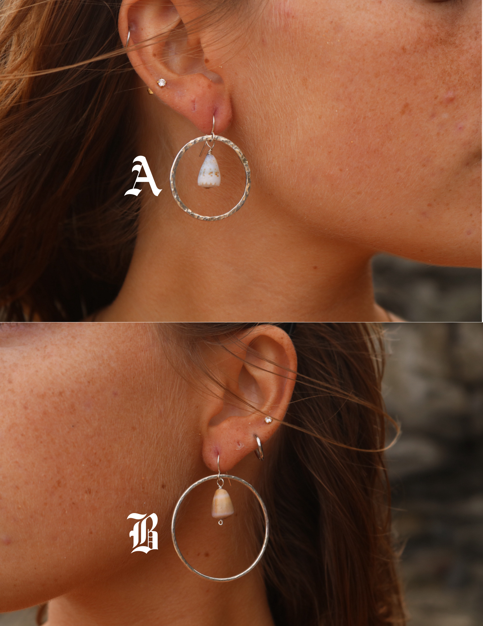sterling silver hoops encapsulating a tiny cone shell (shepherd's hook style)